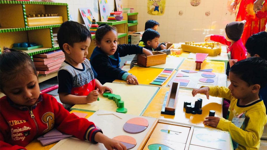 The environment of Amrit Jyoti is specially prepared to be conductive to learning. The child will “learn how to learn” and develop love for work. He/She is introduced to many different subjects,and to creative, sensorial, mechanical, practical and scientific materials as well as various arts, and crafts etc. So that he/she may have chance to fully explore the environment and choose tasks which will correspond to his/her inner development. The child’s mind is channeled to develop fully its capacities, his/her senses are refined to help him towards exactness in judgement, his/her intelligence is guided to perceive minute details and nuances.