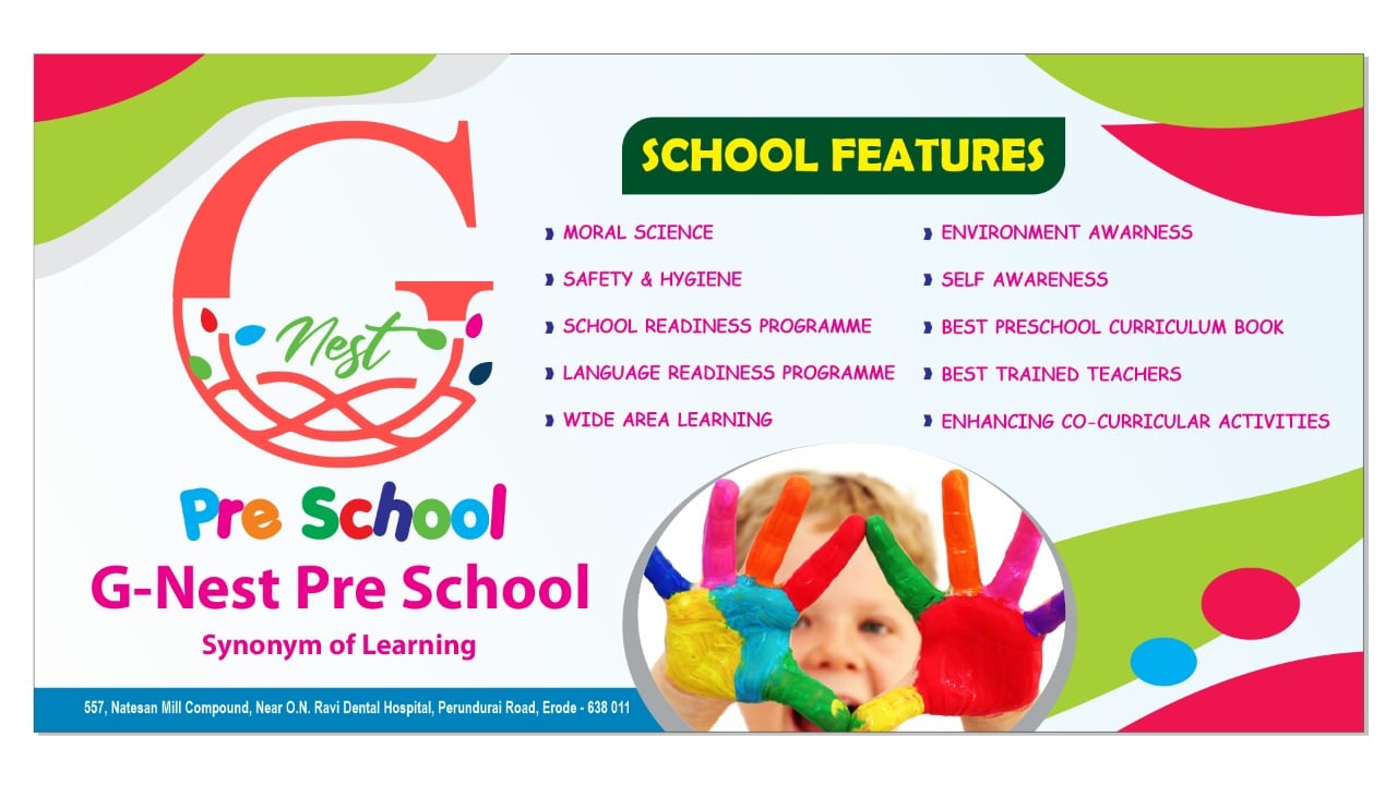 2014Established in the year 2014, G-Nest Pre School in Erode Collectorate, Erode is a top player in the category Kindergartens in the Erode. This well-known establishment acts as a one-stop destination servicing customers both local and from other parts of Erode. It is known to provide top service in the following categories: Playgroups, Kindergartens, Nursery Schools, Pre Schools, Kidzee Pre Schools.