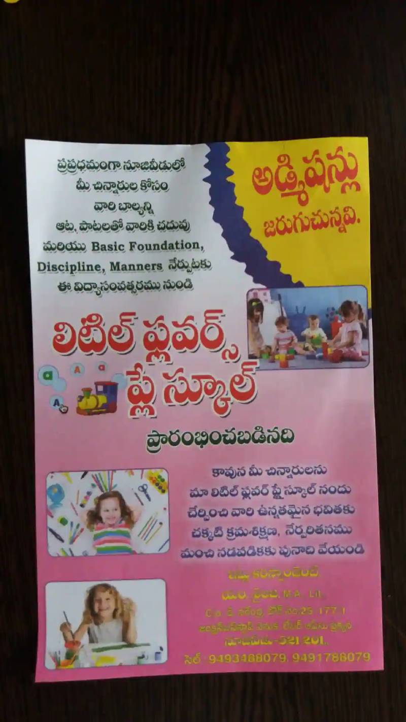 Established in the year 2017, Little Flowers Play School in Nuzvid, Krishna is a top player in the category Kindergartens in the Krishna. In Krishna, this establishment occupies a prominent location in Nuzvid. It is an effortless task in commuting to this establishment as there are various modes of transport readily available. It is at Back Side Of Hanuman Junction Bus Stand, Opposite Exhibition Ground, which makes it easy f... Read More